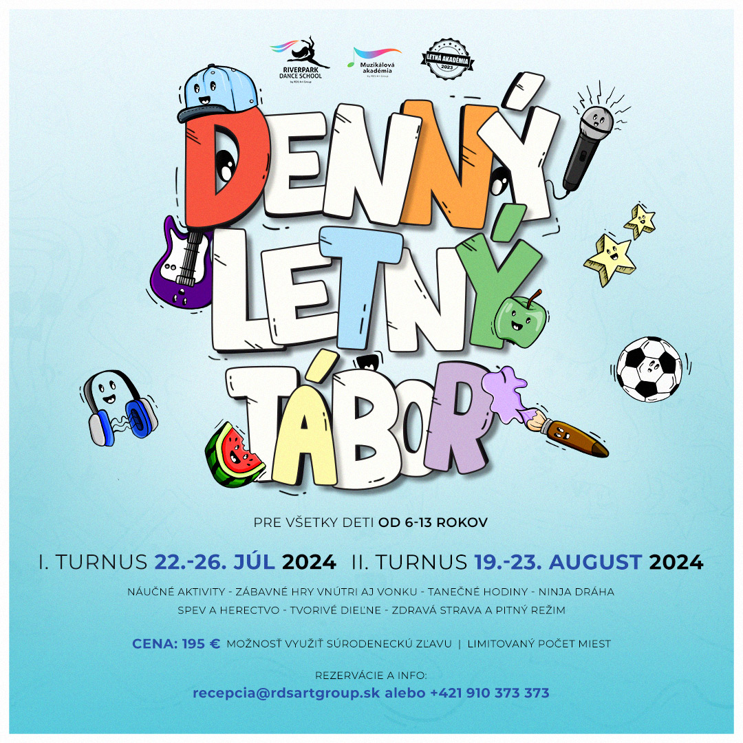 Jedinečný denný tábor, ktorý ponúka bohatý program plný hier, súťaží, športových aktivít, ako aj tanca, spevu, herectva. Deti si vyskúšajú tiež dabing, zažijú ninja dráhu a skúsia nadabovať rozprávku. Navštívia rodinnú bio farmu a uvidia ukážku a interakciu s pravým parašutistom. Celodenná strava, pitný režim a skvelé výlety v Bratislave zabezpečené. Na záver si všetci zahrajú a zaspievajú táborovú skladbu. Zabezpečení sú profesionálni animátori a lektori.