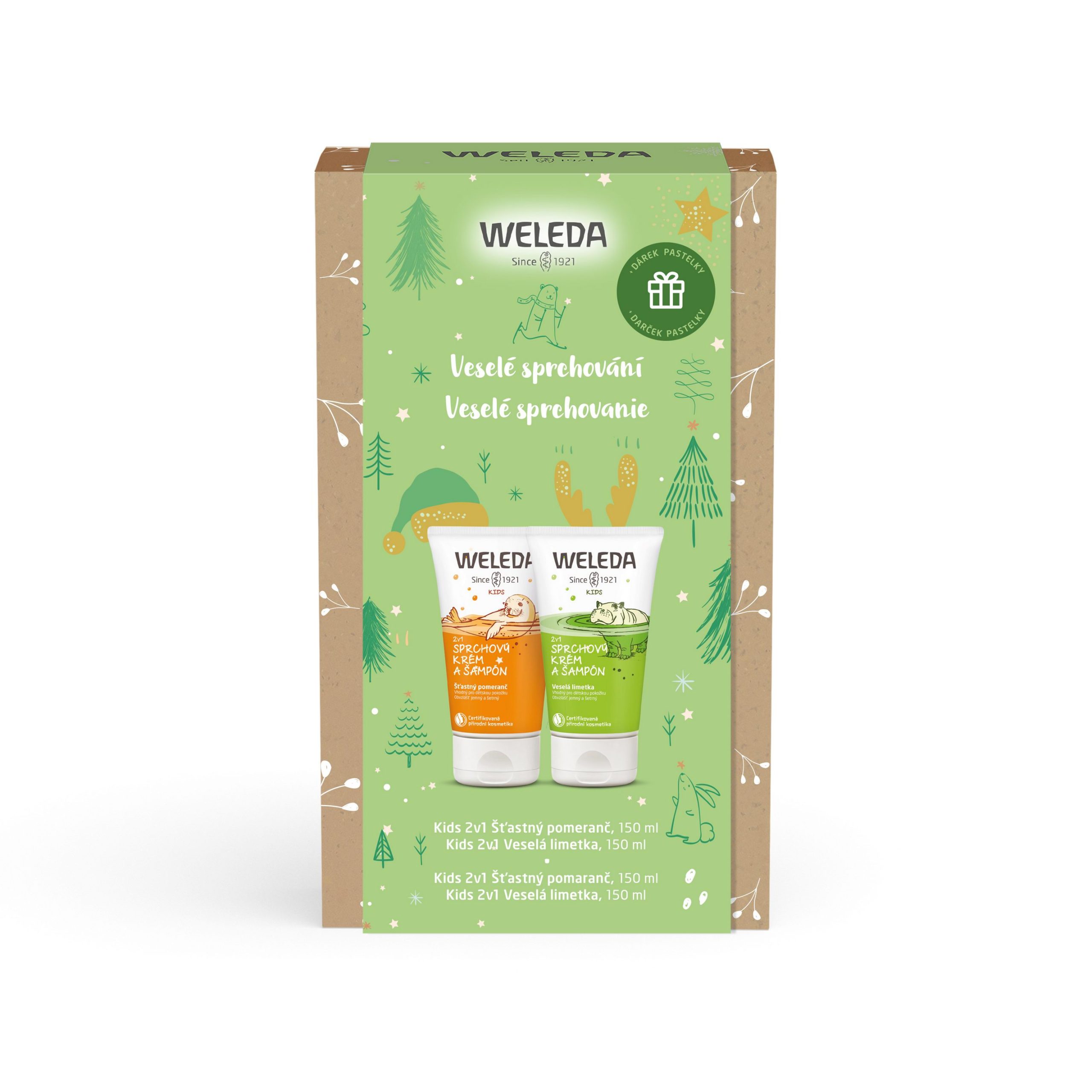 Pretože produktov do sprchy nie je nikdy dosť, v darčekovom sete Veselé sprchovanie od Weledy nájdete hneď dva sprchové krémy 2v1: s vôňou pomaranča a limetky. Vaše ratolesti sa s nimi umyjú od hlavy po päty a ich hravé obaly ich budú baviť. Nevysušujú pokožku, sú šetrné k očiam a krásne voňajú! V sete navyše nájdete aj malý darček v podobe farbičiek 😊