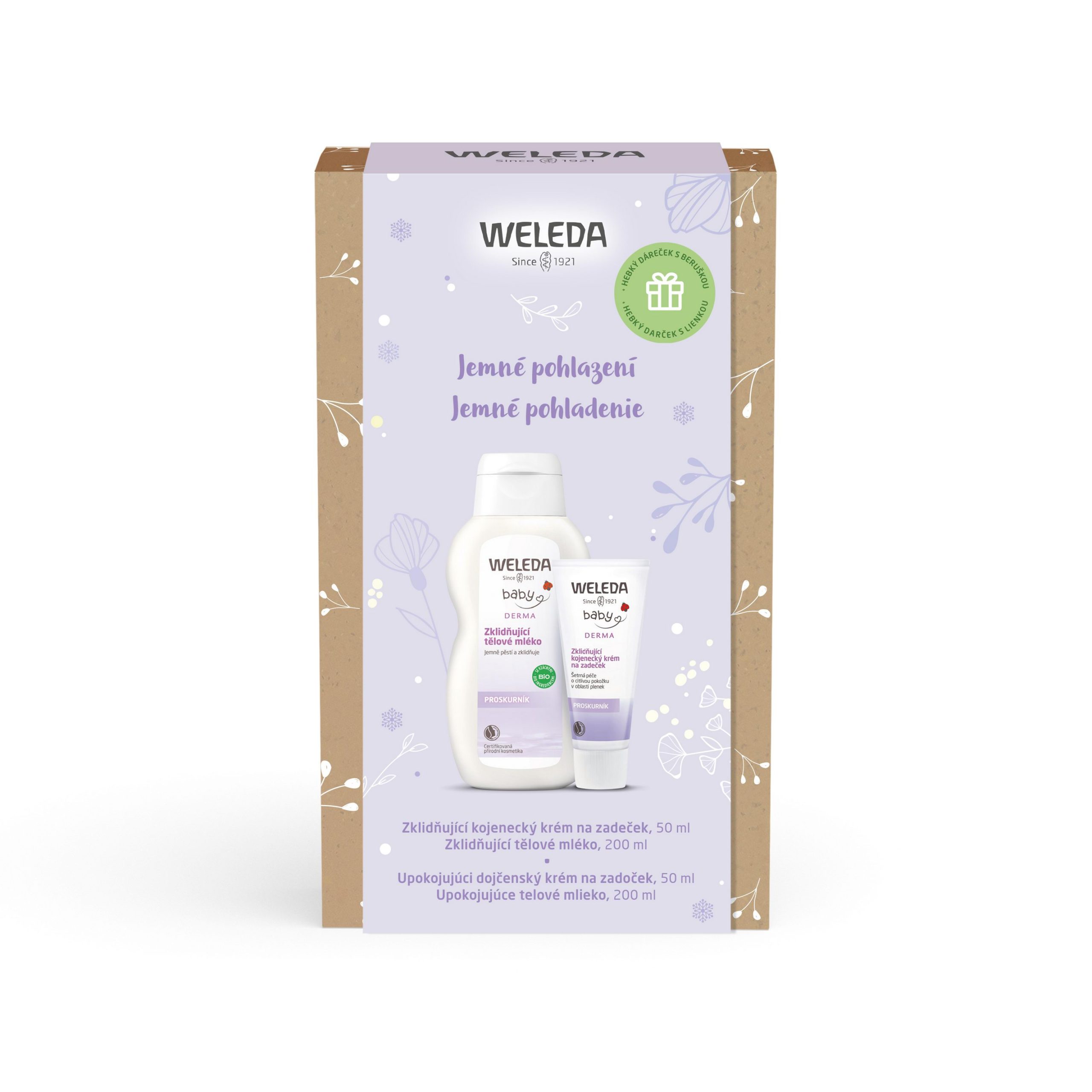 V darčekovom sete Weleda Jemné pohladenie nájdete upokojujúci dojčenský krém na zadoček a telové mlieko, oba z radu Baby Derma. Špeciálne vytvorené pre citlivú a suchú pokožku nielen bábätiek, kombinuje utišujúci extrakt z ibiša, fialky a organický sezamový a kokosový olej. Produkty obsahujú ingrediencie v BIO kvalite, receptúry sú vyvinuté tak, aby pokožku najmenších upokojili, výdatne vyživili a navrátili jej stratenú rovnováhu. Žiadna chémia ani pridaná parfumácia, žiadne nepohodlie. Malým darčekom navyše bude tiež priložený uteráčik s lienkou.