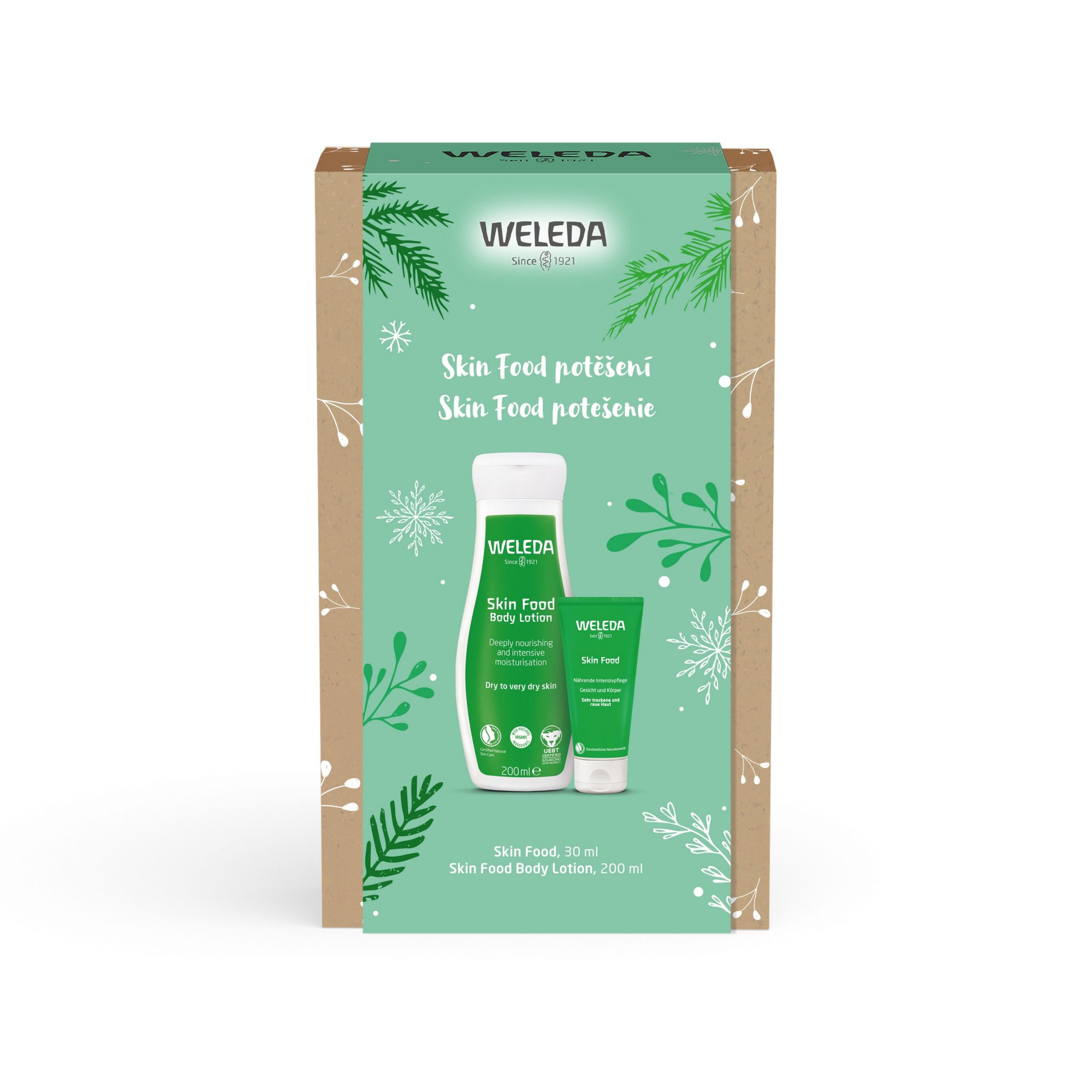 Hľadáte darček, ktorým sa spoľahlivo trafíte do vkusu úplne každého? Stavte na Skin Food, intenzívnu výživnú receptúru, po ktorej túži každá pokožka. V sete sa ukrývajú dva najobľúbenejšie produkty z radu, multifunkčný krém a telové mlieko, ktoré obsahujú extrakty z byliniek a vynikajú ľahkou, pre Skin Food charakteristickou sviežou vôňou. Skin Food je univerzálnou záchranou pre suchú, hrubú pokožku na tvári, lakťoch, rukách i nohách – kdekoľvek, kde vaša pokožka volá po regenerácii. Bohatý základ z olejov a včelieho vosku dopĺňajú extrakty z fialky trojfarebnej, nechtíka a harmančeka. Jedinečné bohaté zloženie 100% prírodného pôvodu s nechtíkom a fialkou je plné rastlinných olejov. Zanechá aj suchú až veľmi suchú pokožku vyživenú a spokojnú a poskytne jej pocit okamžitého pohodlia.