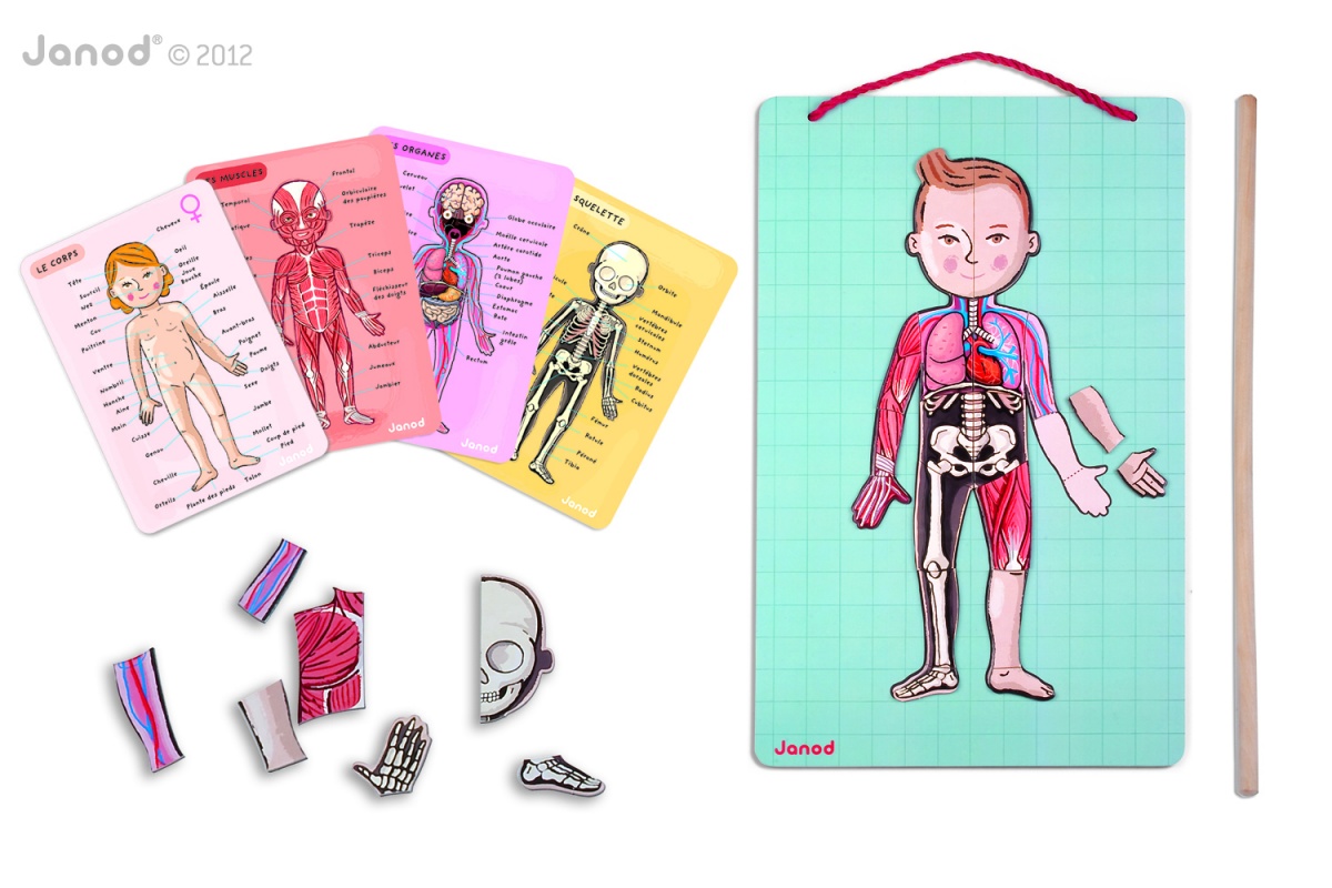 Ľudské telo – Magnetická tabuľa, 4 sústavy ľudského tela (časti tela, vnútorné orgány, svaly, kostra), ktoré je potrebné poskladať z jednotlivých kúskov drevených puzzle. Obsahuje kartičky v slovenskom jazyku, okrem toho ešte 9 ďalších jazykov, čím sa pomôcka stáva vhodným nástrojom aj na výuku v cudzom jazyku.