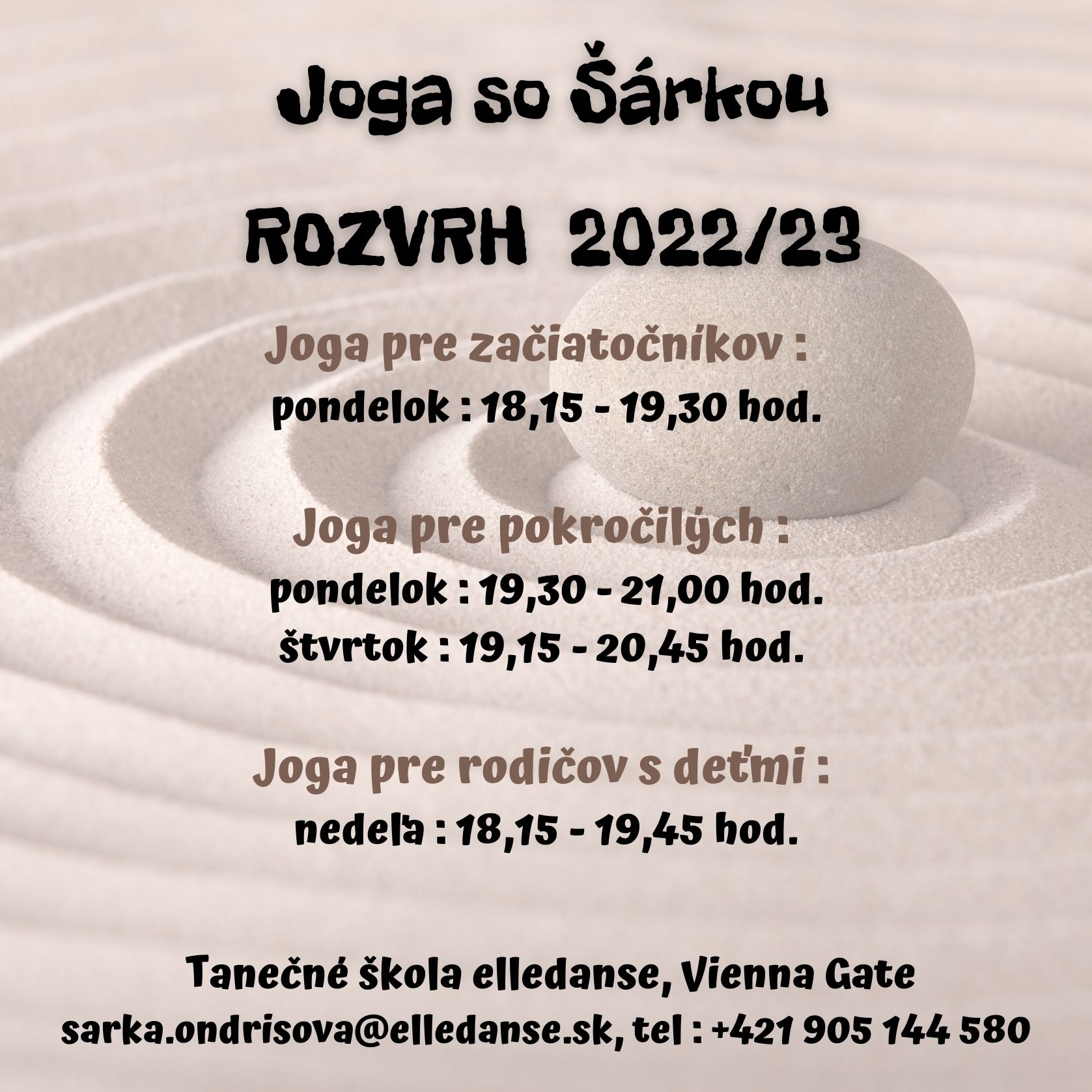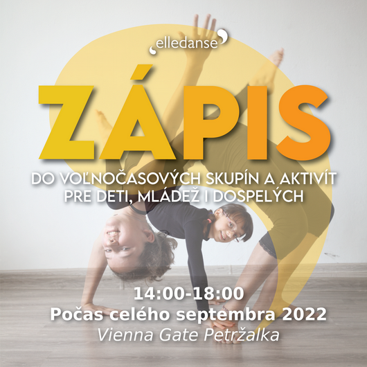 Ak máte doma malého tanečníka, alebo tanečnicu, bojovníka, bojovníčku alebo aj vy máte chuť si po práci oddýchnuť na hodinách jogy – neváhajte! Zápis do voľnočasových kurzov Tanečnej školy elledanse môžete absolvovať osobne vo Vienna Gate na Kopčianskej 8, v Bratislave počas celého septembra 2022 v čase od 14,00 do 18,00 hod./resp. po osobnom dohovore/, mailom: skola@elledanse.sk, alebo telefonicky: 0905 144 580. Viac informácií a rozvrh nájdete na web stránke: www.elledanse.sk.